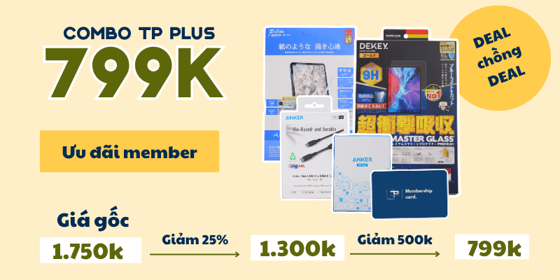 Nếu bạn muốn mua trọn bộ phụ kiện cho iPad nhưng vẫn tiết kiệm chi phí, TP Mobile gợi ý combo PR TP Plus độc quyền – bao gồm: ốp lưng, cường lực Dekey, dán Paperlike, khăn lau chuyên dụng và ưu đãi Apple Pencil hoặc sạc nhanh.